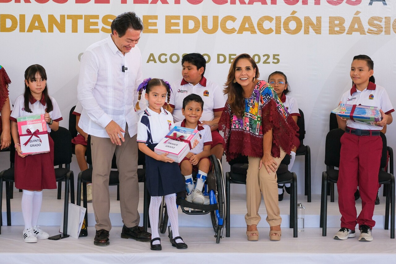 La gobernadora de Quintana Roo, Mara Lezama Espinosa, y el secretario de Educación Pública de México, Mario Delgado Carrillo, iniciaron la entrega de libros de texto gratuito a estudiantes de educación básica, en un evento efectuado este viernes 22 de agosto en la primaria Gualberto Salazar Centeno, de Cancún.