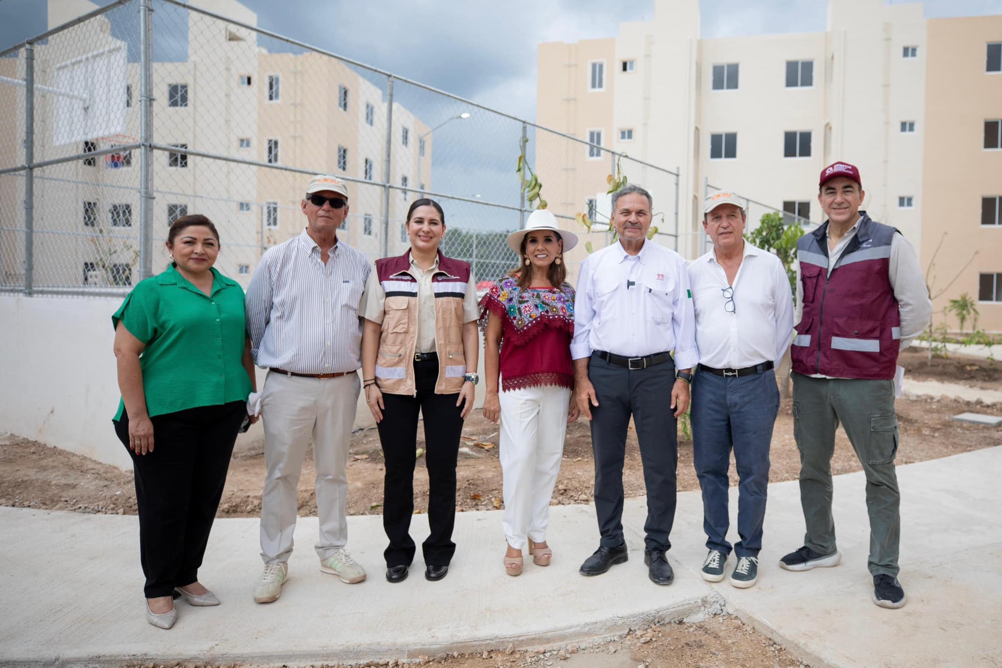 La gobernadora Mara Lezama Espinosa; el director general del Infonavit, Octavio Romero Oropeza, y la presidenta municipal de Playa del Carmen, Estefanía Mercado, recorrieron el fraccionamiento El Edén, donde se construyen las casas del programa Vivienda para el Bienestar, que impulsa la presidenta Claudia Sheinbaum.