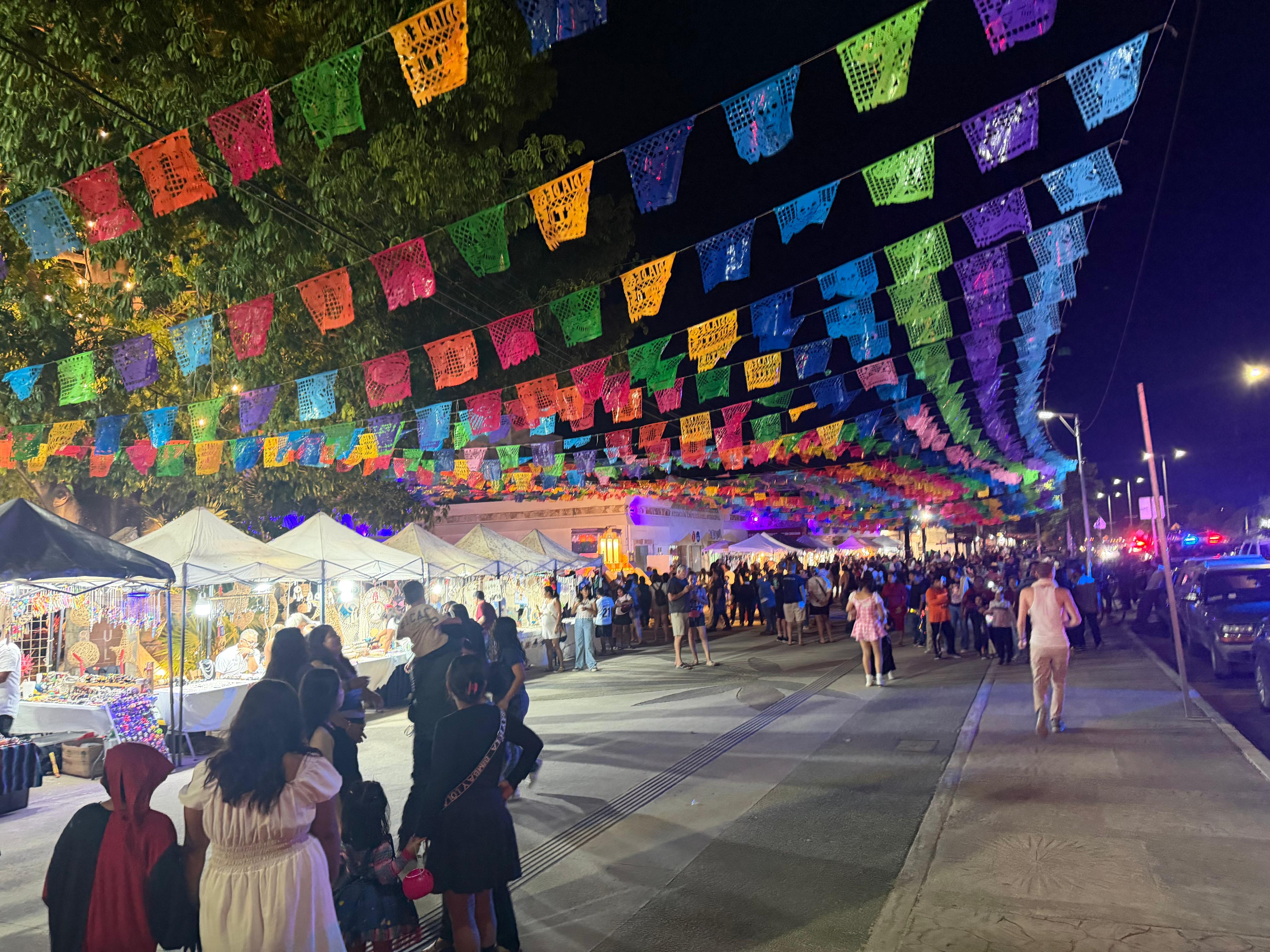 Por las noches, el ambiente se transformó en una auténtica fiesta para los sentidos. Desfiles de catrinas, comparsas, concursos de disfraces y presentaciones artísticas animaron las calles, mostrando la creatividad y el talento de los tulumnenses.