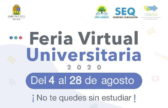 Del 4 al 28 de agosto del presente, se llevará a cabo la Primera Feria Virtual Universitaria “No te quedes sin estudiar”, con el objetivo de que los jóvenes egresados de educación media superior del estado que no hayan realizado su proceso de ingreso en alguna institución de educación superior, conozcan la oferta académica y las oportunidades que aún tienen para continuar sus estudios superiores.