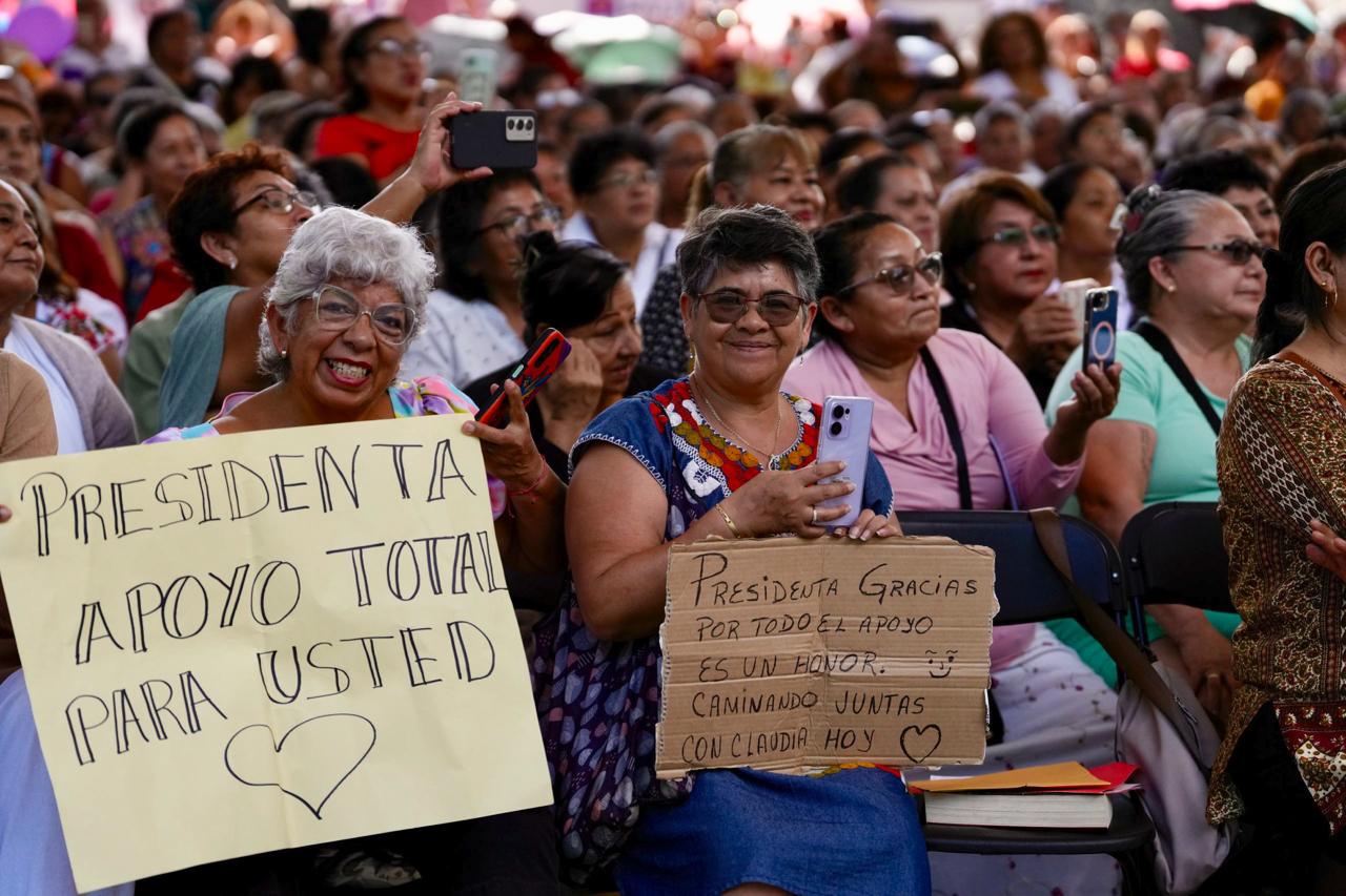 En Puerto Morelos, acompañada de la gobernadora Mara Lezama y las secretarias de las Mujeres y del Bienestar, Citlali Hernández y Ariadna Montiel, respectivamente, la presidenta de México, Claudia Sheinbaum, encabezó la asamblea de la Pensión Mujeres Bienestar.