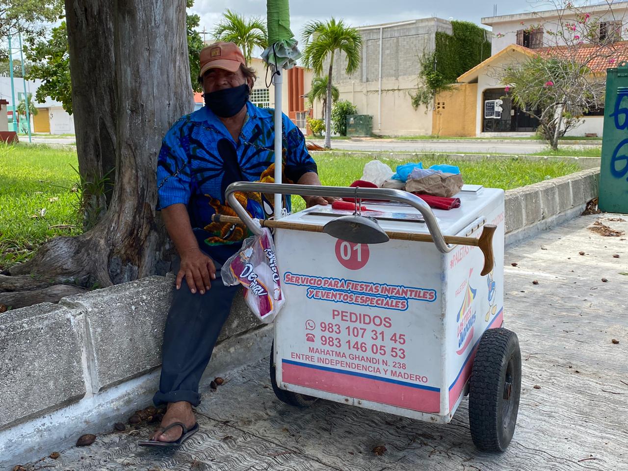 Con un cubrebocas improvisado hecho con un pedazo de tela negra y resorte, don Víctor se sienta en el parque Los Caimanes, ubicado en el centro de Chetumal, y recuerda cómo hasta hace unos meses, incluso al inicio de la pandemia, aún vendía todo su producto en tres o cuatro horas y sin caminar mucho.