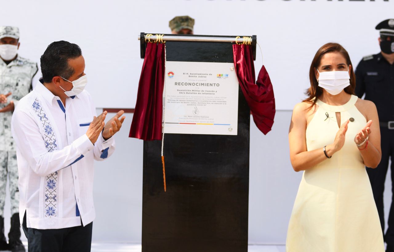 En reconocimiento a quienes participaron en la entrega de apoyos alimentarios y a quienes han estado al frente en la atención de la ciudadanía para salvar vidas, durante la emergencia causada por el COVID-19, el gobernador Carlos Joaquín González encabezó una ceremonia cívica en la Guarnición Militar de Cancún.