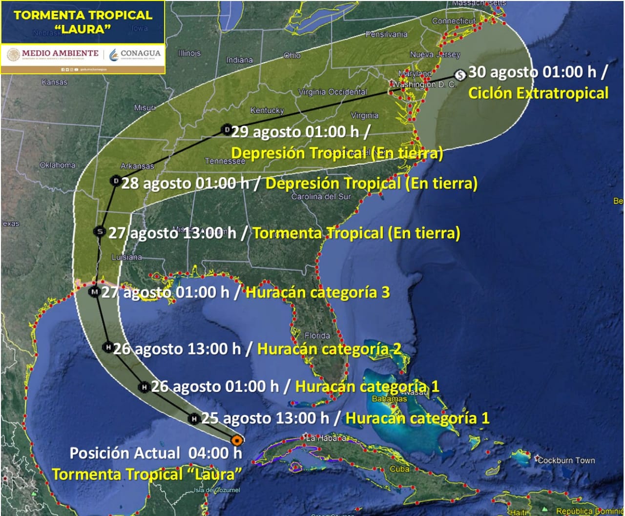 De acuerdo con Antonio Morales Ocaña, meteorólogo de Solidaridad, a las 7 horas de este hoy 25 de agosto Laura se ubicaba a 205 kilómetros al noreste de Cabo Catoche, por lo cual no representa peligro para el estado. “Sus bandas nubosas asociadas con fuerte actividad lluviosa están llegando a gran parte de la Península de Yucatán”, mencionó el meteorólogo.