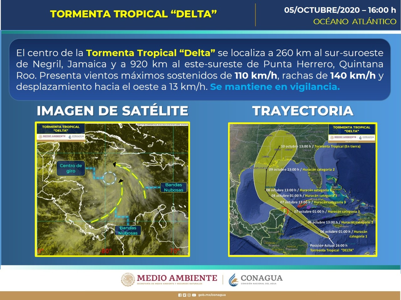 De acuerdo con el más reciente reporte de la Comisión Nacional del Agua: "Delta se desplaza hacia el oeste sobre el Mar Caribe, aproximándose gradualmente a las costas de Quintana Roo. Se estableció zona de prevención por vientos de huracán desde Río Lagartos, Yucatán hasta Tulum, Quintana Roo”.