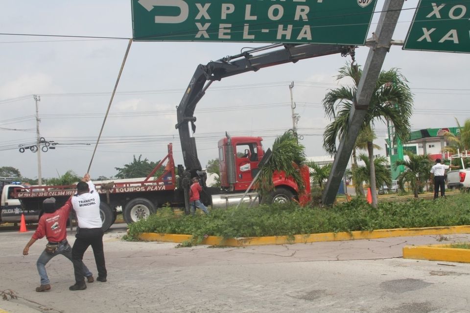 Oficiales de la dirección de Tránsito de Solidaridad removieron señalamientos ubicados sobre el bulevar Playa del Carmen en riesgo de caer y provocar un accidente a los ciudadanos tras el paso del huracán Delta.