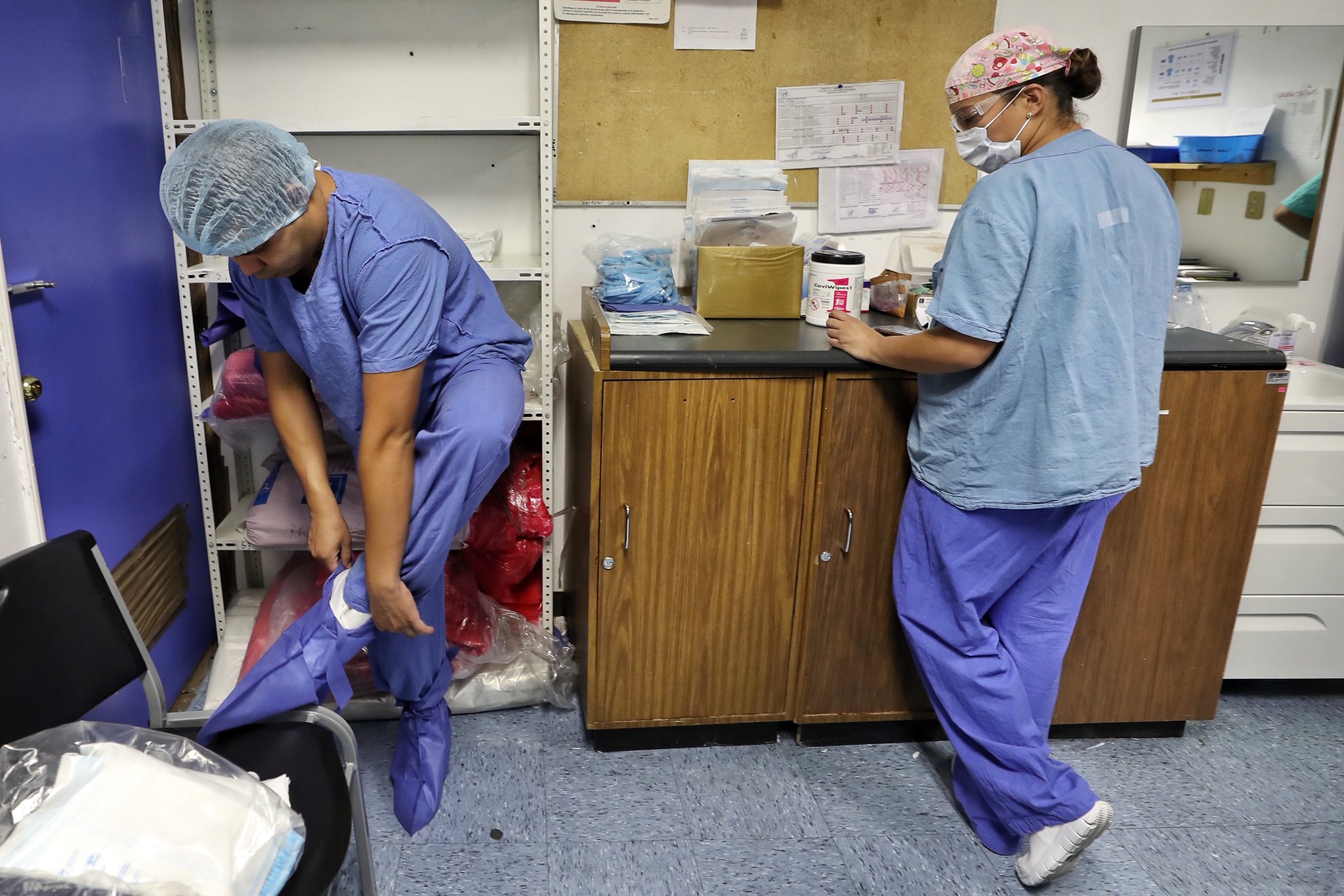 Médicos, junto con personal de enfermería e intendencia, pasan todas las mañanas a la dirección del nosocomio por su equipo de protección, que consta de un uniforme quirúrgico, dos pares de botas, gorro, goggles, cubrebocas N95, una bata desechable, overol, guantes de nitrilo y un segundo par de guantes de látex para colocarse antes de ingresar al área en donde permanecerán al menos unas ocho horas y en turnos vespertinos y especiales hasta 12 horas.