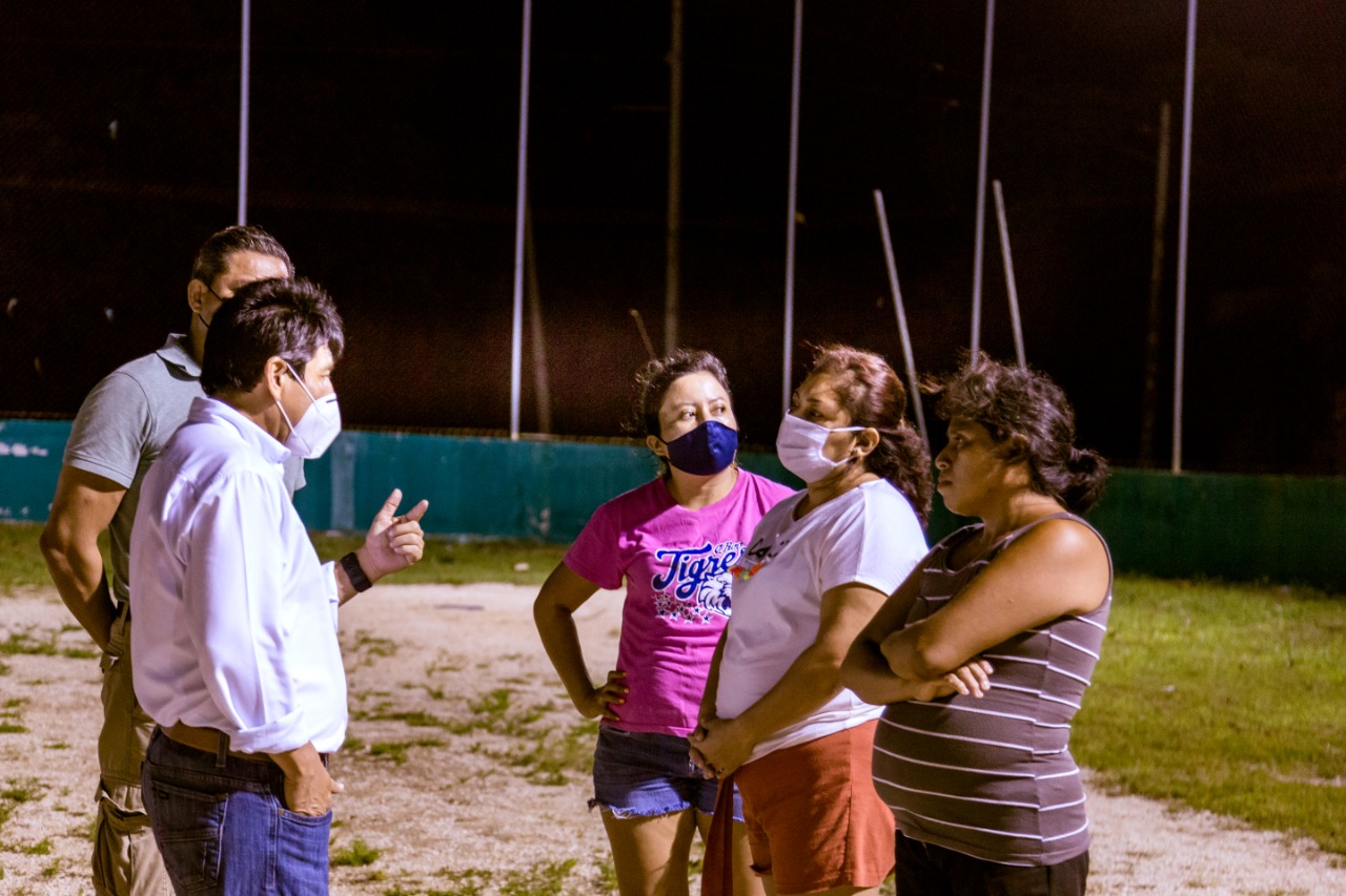 En el recorrido por Chemuyil el munícipe acudió con el director de Obras Públicas al campo de béisbol para evaluar daños ocasionados por Zeta, donde el techo de láminas de las gradas se desprendió casi en su totalidad.