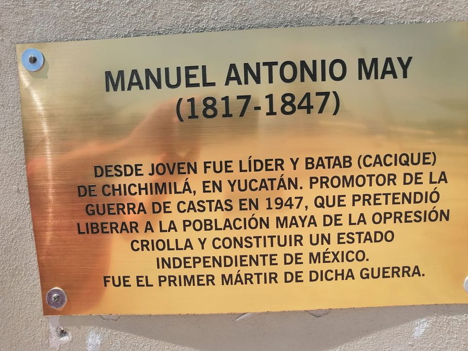 Otra de las placas hace referencia a Manuel Antonio Ay, aunque la placa dice “Manuel Antonio May” y refiere que éste nació en 1817 y murió en 1847 -dato correcto-, excepto que en el texto que le acompaña se sostiene que fue “promotor de la Guerra de Castas en 1947”, es decir, 100 años después del año correcto. El texto, es prácticamente el mismo que acompaña la biografía de dicho personaje en Wikipedia.