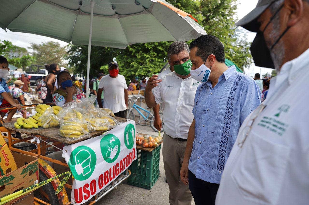 El gobernador Carlos Joaquín visitó el tianguis de la región 227 de Cancún para constatar la aplicación de los hábitos de higiene para la nueva normalidad, con los que se promueve el equilibrio entre la reactivación de la economía y el cuidado de la salud para evitar rebrotes por COVID-19.