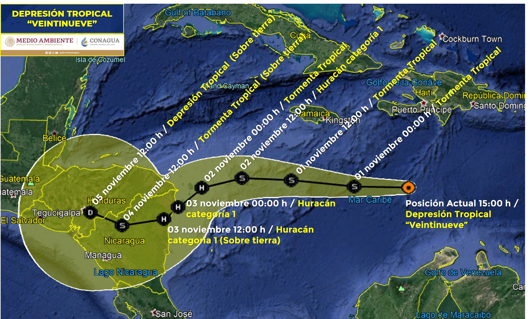 La baja presión ubicada en el mar Caribe se convirtió la tarde de este sábado en la depresión tropical 29. De seguir evolucionando será la tormenta tropical Eta, un nombre nunca utilizado para un fenómeno hidrometeorológico.