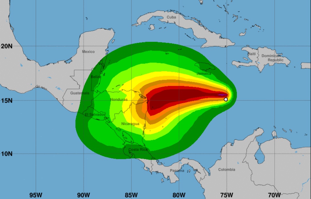 El pronóstico del servicio meteorológico la ubica el martes 3 de noviembre en tierra como huracán categoría uno, en Nicaragua. Afectaría también a Honduras, Guatemala y Belice.