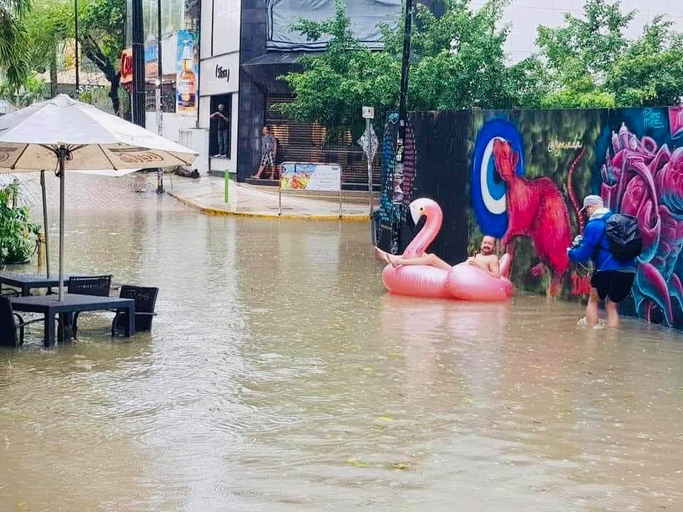 En Playa del Carmen las lluvias inundaron el cruce de la Quinta avenida con la calle 16, donde un ciudadano aprovechó para sacar un flotador inflable de cisne y hacer una sesión fotográfica para redes sociales.