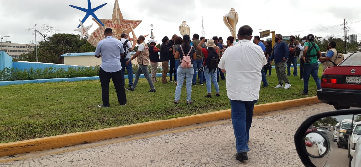 La glorieta del ceviche, en Cancún, fue el escenario en el que integrantes de los medios de comunicación se manifestaron contra la represión policiaca ocurrida la noche del lunes en el palacio municipal de Benito Juárez.