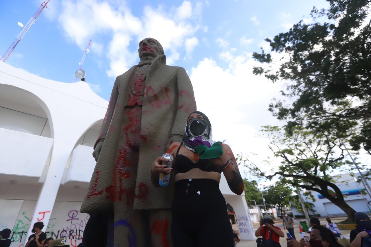 También la estatua de Benito Juárez fue vandalizada, al igual que un módulo de seguridad pública ubicado a un costado del palacio municipal. “Todas las morras que están aquí valen más que esta p… estatua”, gritó una de las manifestantes que hacía las pintas al monumento.