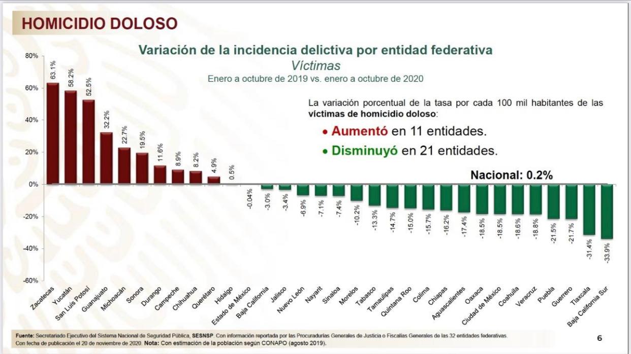 “Los niveles de violencia se están conteniendo ya que la cifra de víctimas de homicidio doloso de enero a octubre de 2020 es 15 por ciento más baja respecto al mismo periodo en 2019, con 507 contabilizados, de acuerdo con los registros de incidencia delictiva proporcionados por la Fiscalía General del Estado (FGE) al SESNSP”, menciona el comunicado.