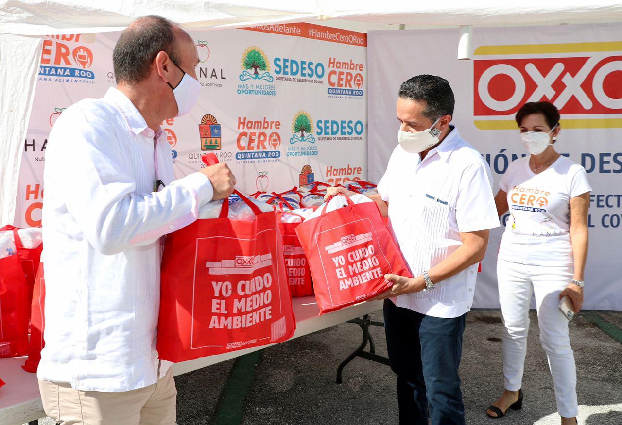 El gobernador Carlos Joaquín González recibió la donación de 907 despensas de la cadena comercial OXXO, que se suman al programa Hambre cero para reducir la carencia alimentaria de las familias afectadas por la pandemia del COVID-19.