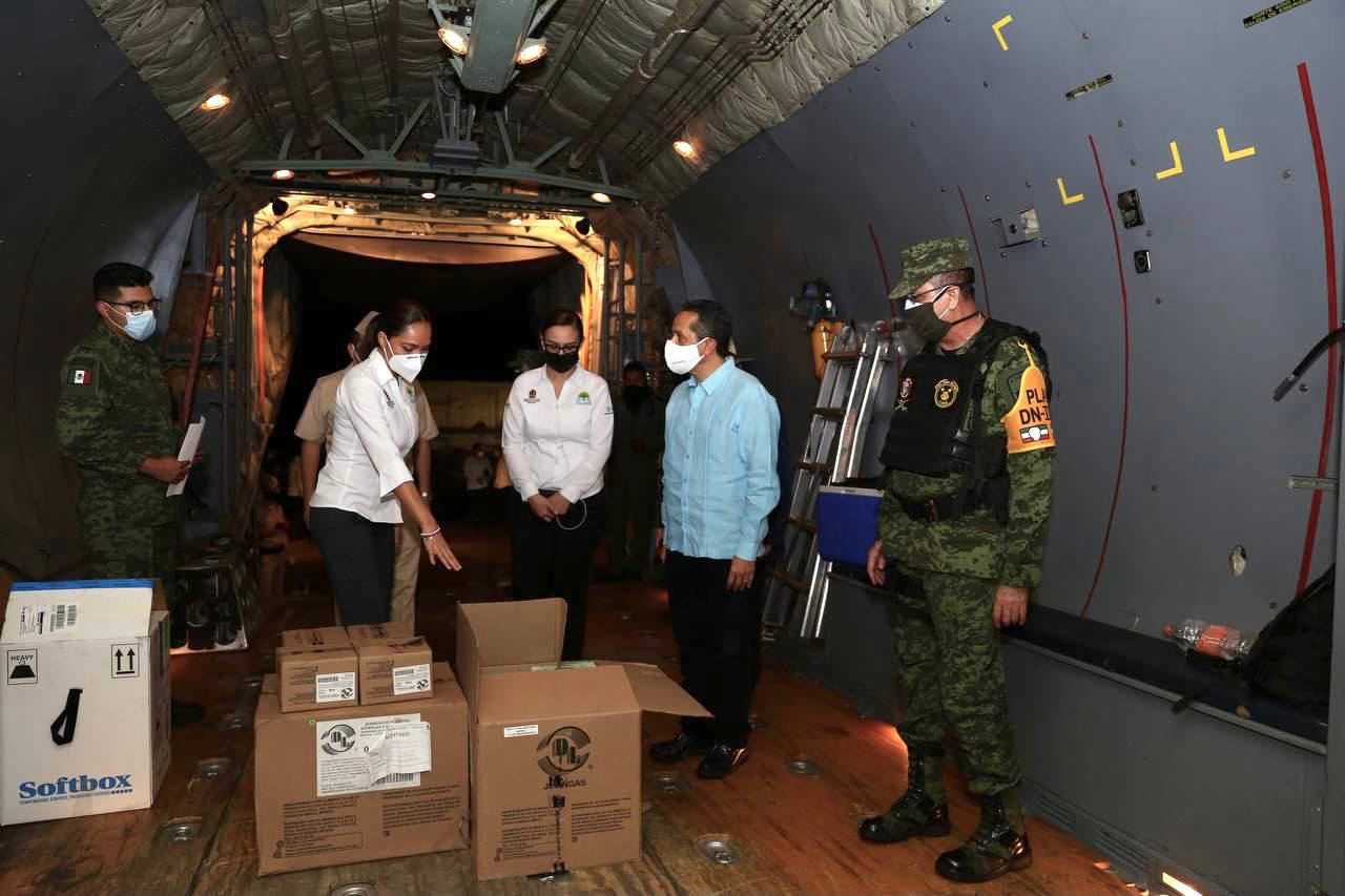 Alrededor de las 21 horas de este martes llegó a Cancún el vuelo de la Secretaría de la Defensa Nacional que transportaba el primer lote de vacunas anti COVID-19 para Quintana Roo y que serán aplicadas al personal de primera línea de atención a pacientes con la enfermedad. Posteriormente, a las 22:20 horas, la aeronave con el biológico arribó al aeropuerto internacional de Chetumal.