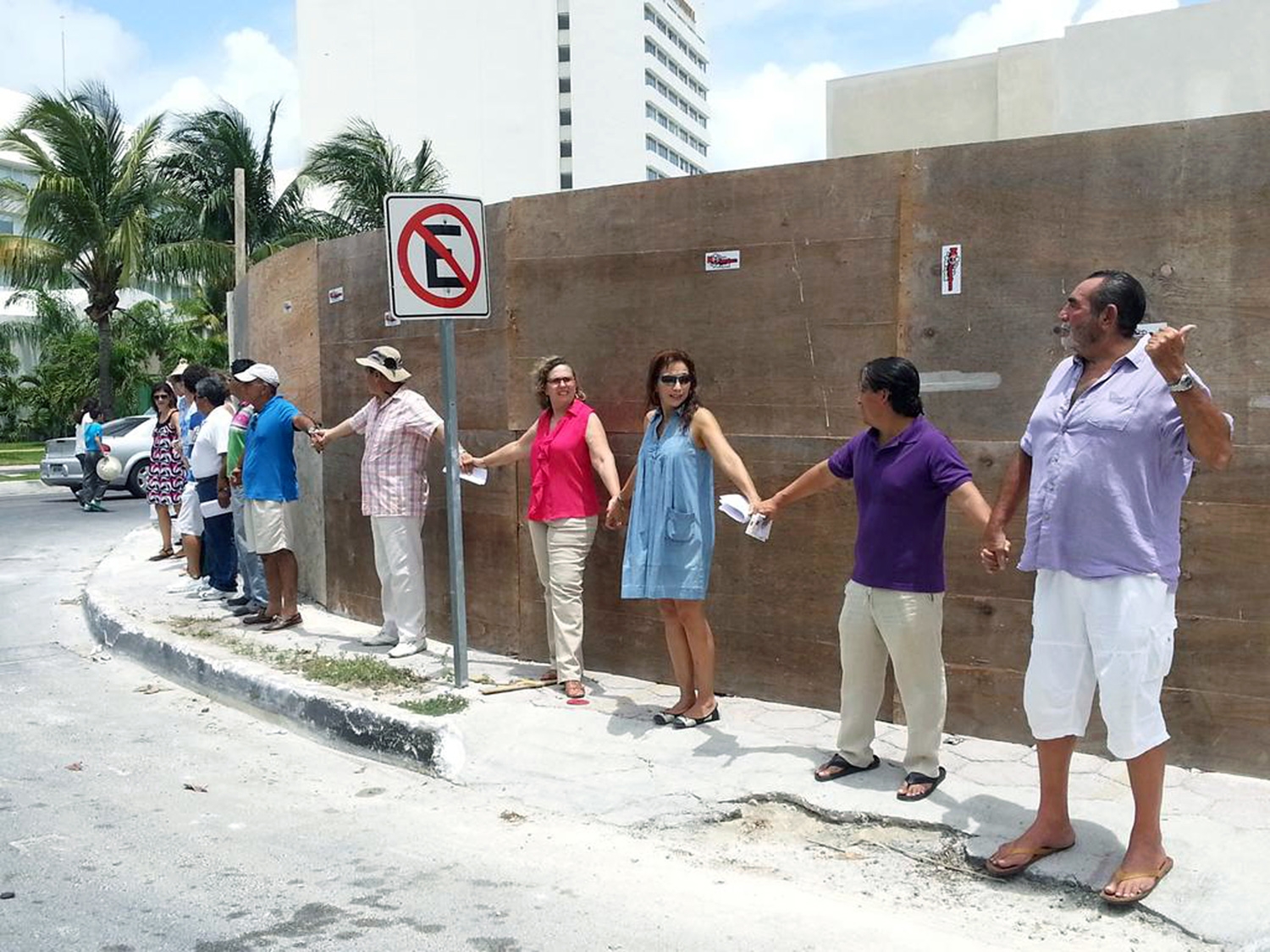 Vecinos del fraccionamiento residencial de Pok Ta Pok y trabajadores del hotel Presidente Intercontinental (frente a la obra) se unieron para formar una cadena humana en protesta por la construcción de una gasolinera en el kilómetro ocho del bulevar Kukulkán, a un costado de una plaza comercial y a cerca de 25 metros de los manglares del Sistema Lagunar Nichupté.