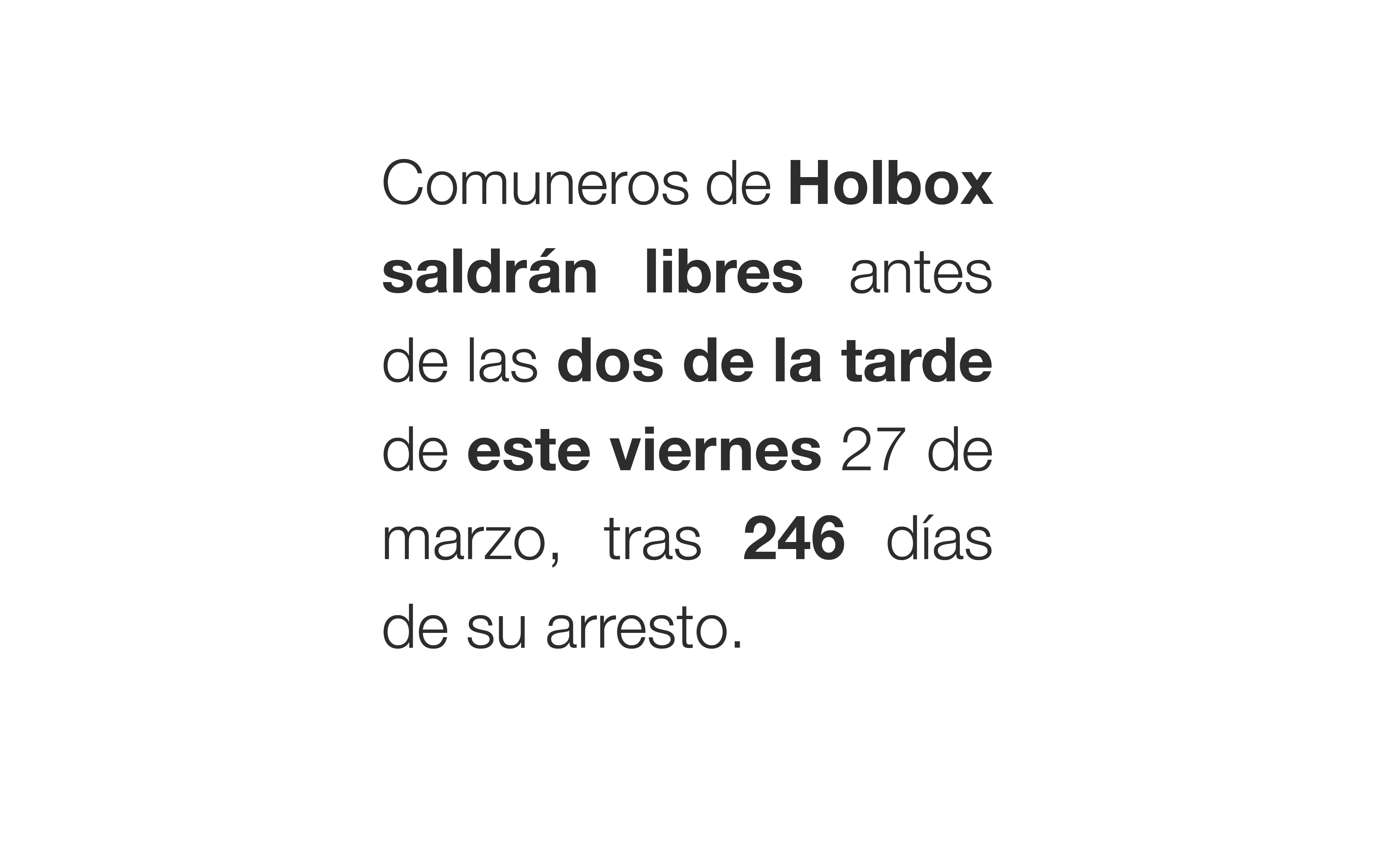 Cancún.- Tras más de ocho meses en prisión, los 12 comuneros de Holbox aún recluidos por presuntos delitos ambientales saldrán libres, como máximo, antes de las dos de la tarde del viernes 27 de marzo, informó Josué Nivardo Mena Villanueva.