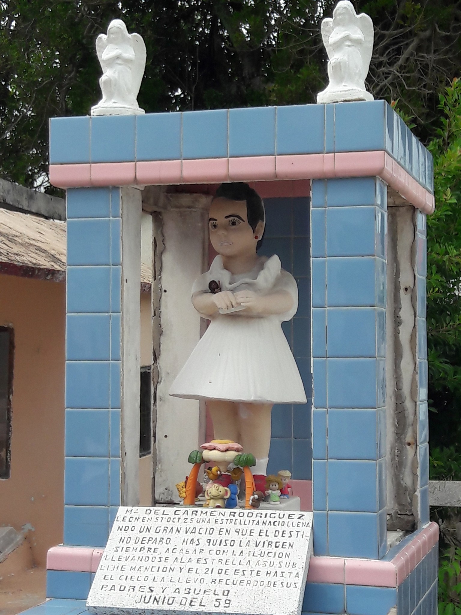 [i]La niña del taco[/i], quien en vida llevó el nombre de María del Carmen Rodríguez León, murió a la edad de dos años el 21 de junio de 1959. Su tumba de azulejos, se adorna de una figura de cerámica con cabello oscuro y piel blanca, de alrededor de medio metro de altura que posa con un taco en la mano y un vestido blanco.