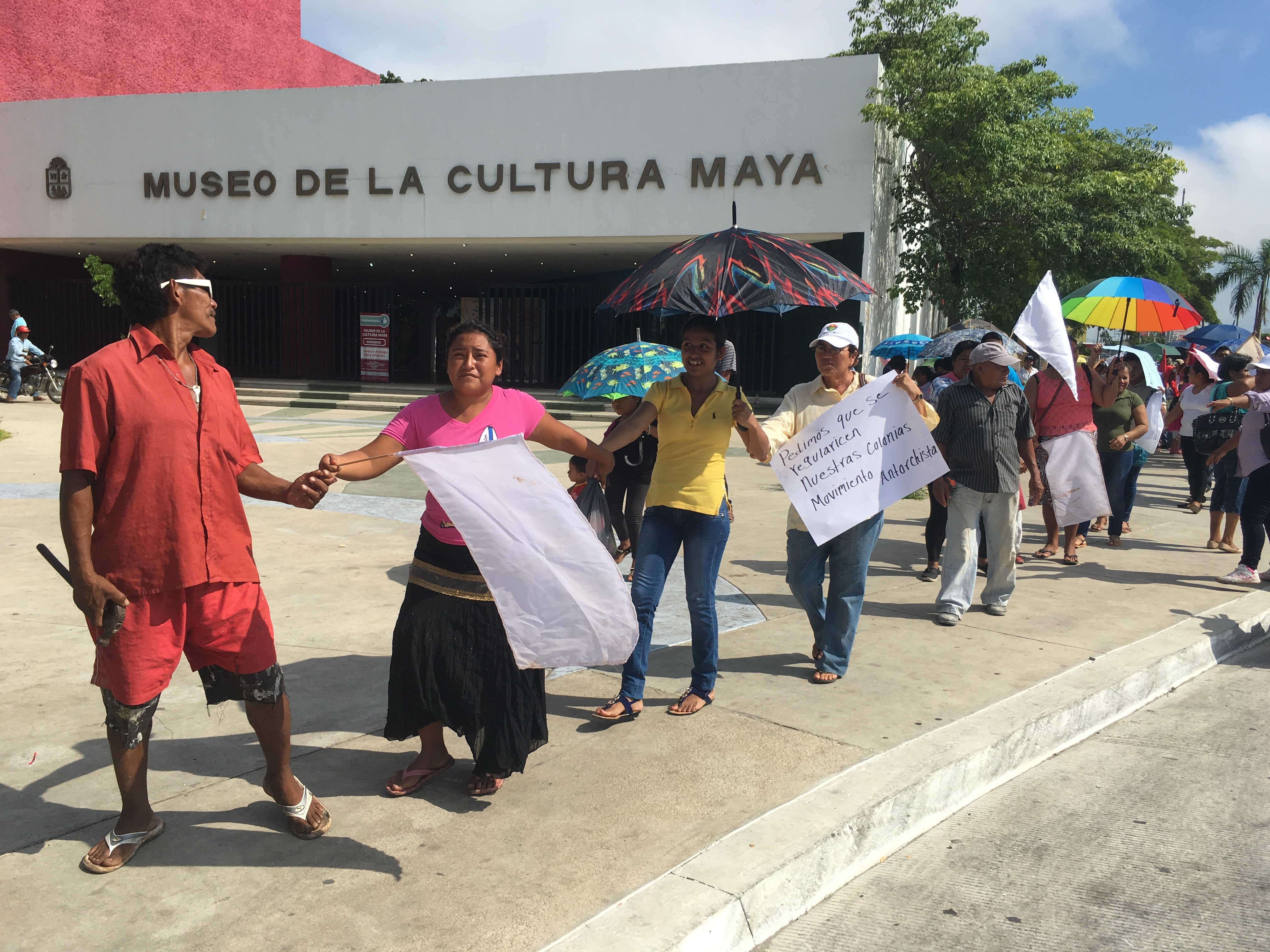 La semana pasada se manifestaron y este jueves alrededor de 200 personas, conformaron una cadena humana que caminó por las banquetas de la Avenida Héroes desde el Museo de la Cultura Maya hasta Palacio de gobierno, con pancartas en mano en donde exigían viviendas dignas.