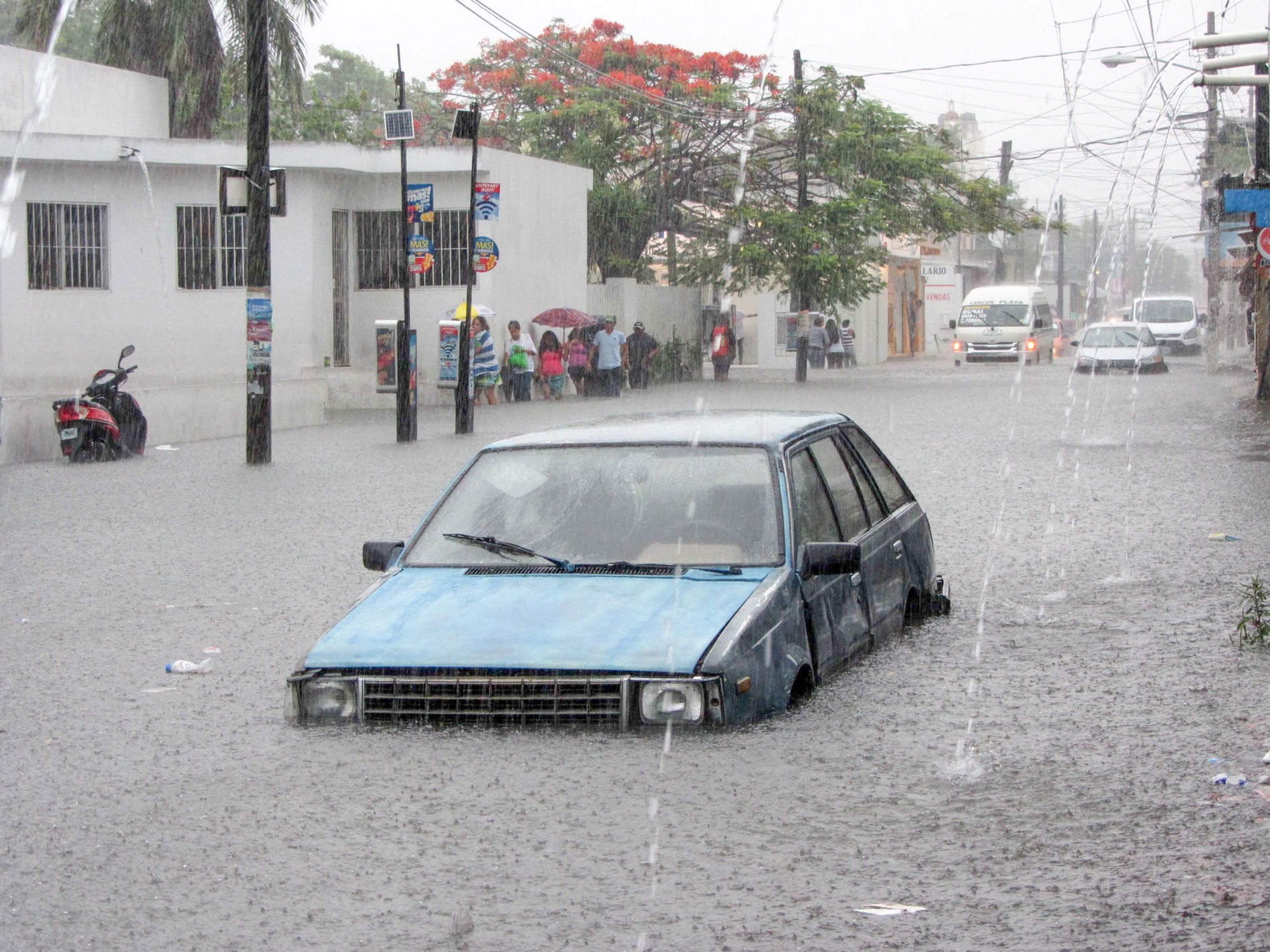 El paso de la Onda Tropical numero 21 ocasiona fuertes inundaciones registradas por avenidas y calles de Cancún. En la imagen, calle de acceso principal al Hospital General de Cancún, ubicado en el Crucero.