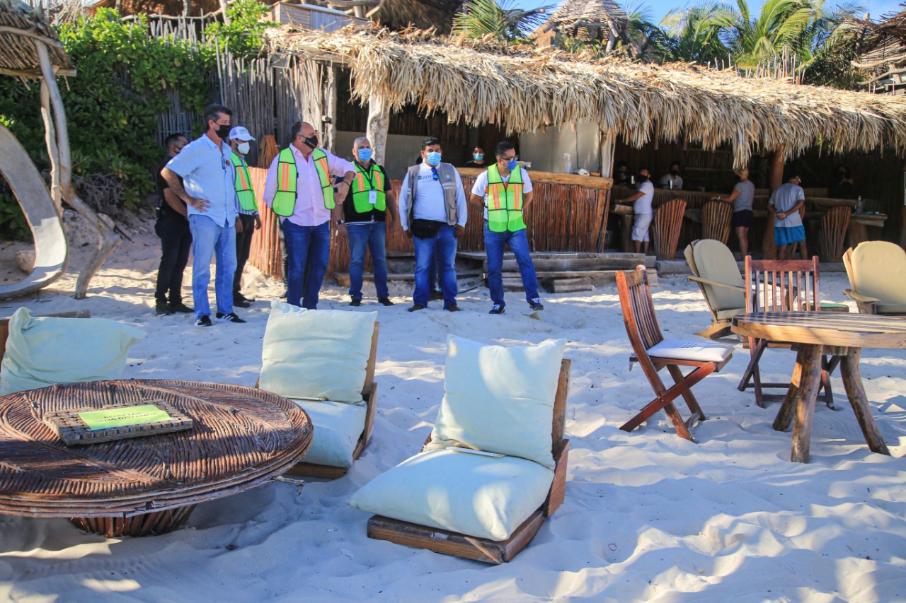 Durante un recorrido realizado en la zona costera, el tesorero y los directores de Zona Federal Marítimo Terrestre, Ingresos y Fiscalización, dialogaron con empresarios y colaboradores de los establecimientos Azulik, Taboo, Mía, Bagatelle, Vagalume y Rosa Negra, para exhortarlos a respetar los acuerdos, evitar eventos masivos, mantener el número de clientes debajo de 30 por ciento, pedirle al visitante el uso de cubrebocas, tomarles la temperatura, aplicar gel antibacterial y respetar los horarios establecidos a fin de coadyuvar en las acciones de prevención y evitar sanciones económicas o la clausura del establecimiento.