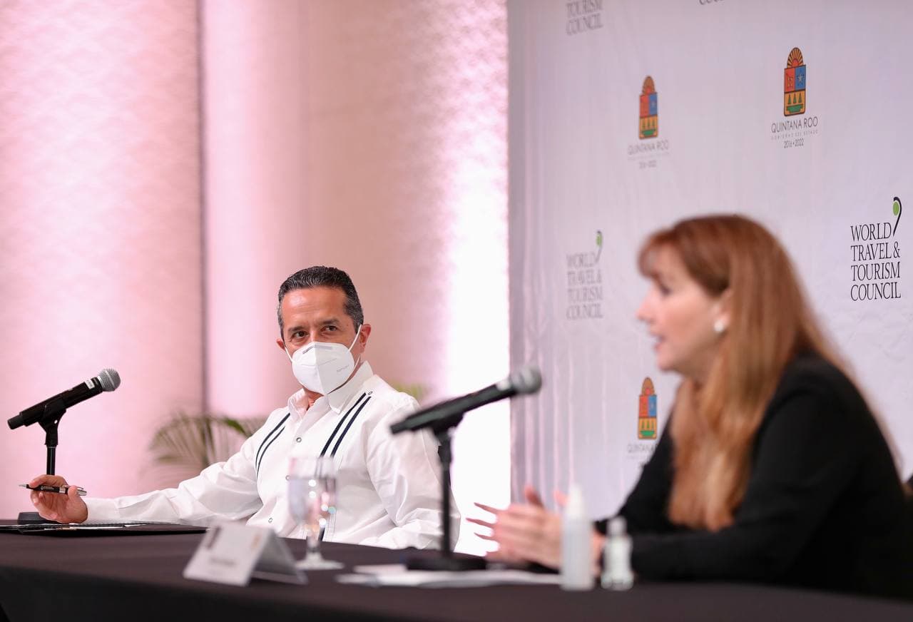 Guevara Mazo encabezó la mañana de este jueves junto al gobernador Carlos Joaquín la conferencia de prensa donde se dieron a conocer detalles de la Cumbre Mundial del WTTC, del 25 al 27 de abril en Cancún, que, bajo el lema “Uniting the World for Recovery”, será la plataforma para la recuperación del sector.