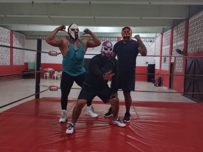 En la arena Colonos de la supermanzana 89 está instalado un ring donde la lucha libre sigue viva pese a la pandemia. No con el público presente, los gritos y las porras, vive apenas con los sonidos de los cuerpos pegando sobre la lona de un grupo de luchadores que no dejan su pasión y siguen entrenando por las noches después de que cada uno tiene su actividad laboral para sacar adelante a sus familias.
