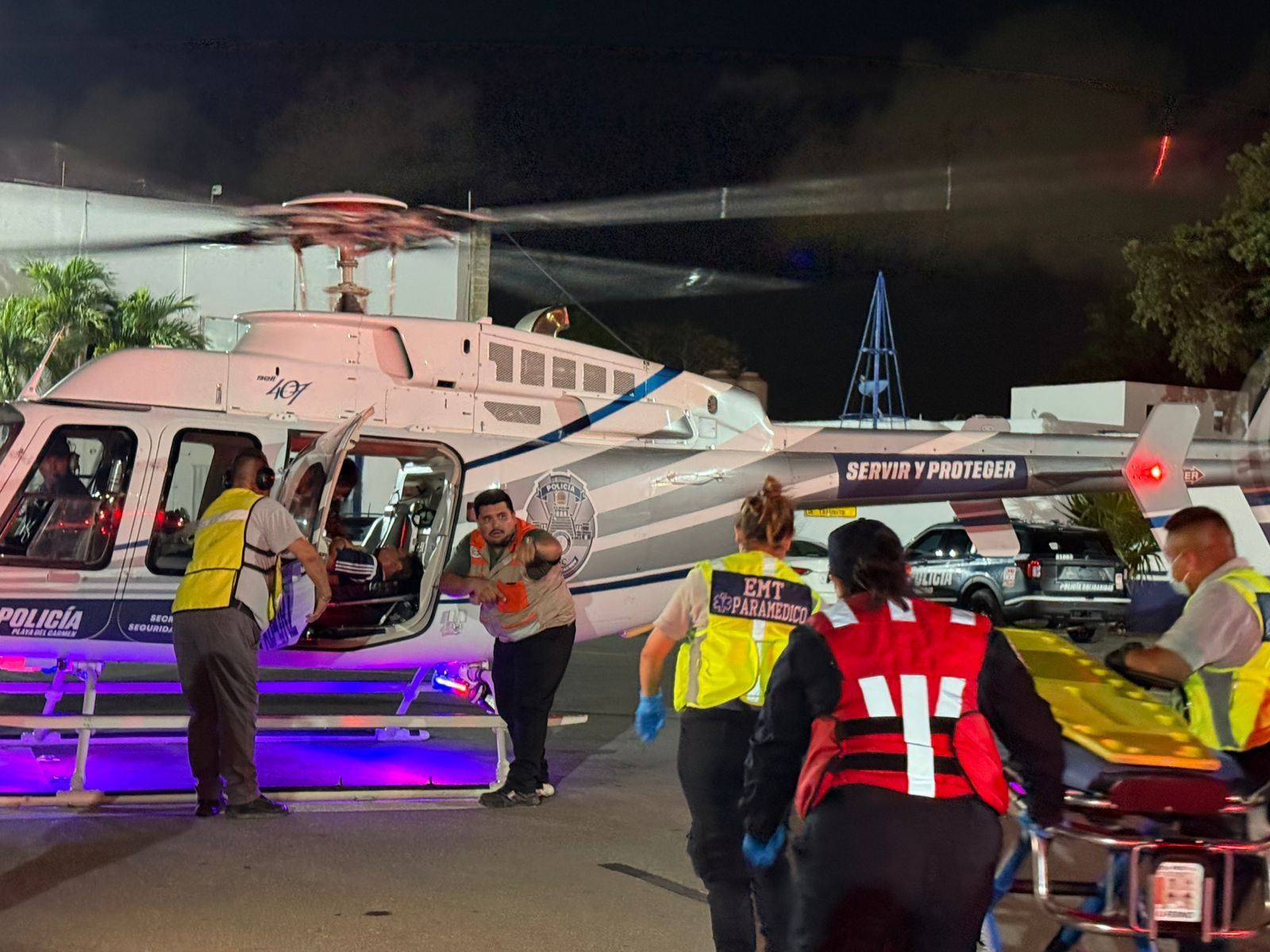 Gracias a la inmediata respuesta de los cuerpos de emergencia y al uso del helicóptero municipal —adquirido como parte de la histórica inversión en seguridad y protección civil impulsada por el gobierno de la presidenta Estefanía Mercado— se logró trasladar vía aérea a un lesionado hacia el hospital general de zona del IMSS Número 18 de Playa del Carmen.