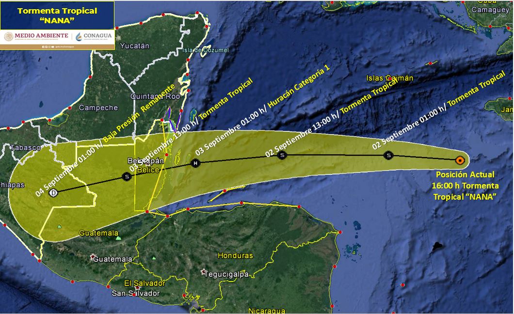 El gobierno de Quintana Roo emitió esta noche alerta azul para el sur del estado, específicamente para el de Othón P. Blanco y Bacalar, por la tormenta tropical Nana, que se ubica en el mar Caribe.