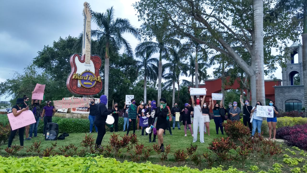 La tarde de este miércoles activistas feministas del colectivo Siempre Unidas se manifestaron a las afueras del hotel Hard Rock, exigiendo a los directivos del centro de hospedaje mayor seguridad para sus empleadas, un servicio de transporte que les garantice que volverán a sus casas con vida y accesos seguros e iluminados.