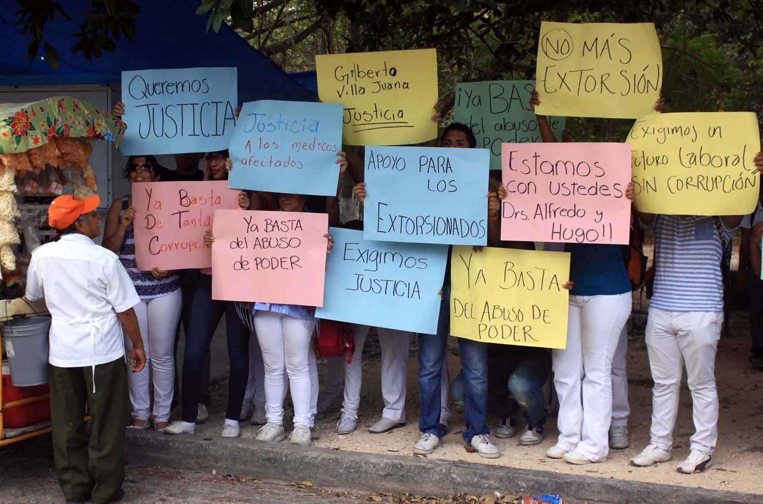 El 23 de marzo, los galenos Hugo Murillo Arenas (urgenciólogo) y Alfonso Hu Alayón (bioquímico) denunciaron el hostigamiento y la extorsión por parte del líder sindical; ese día, Ricardo Ríos Garibay, jefe de cirujanos de la clínica-hospital de Cancún, calificó a Villajuana Balam y su comité como “el cártel del ISSSTE”.