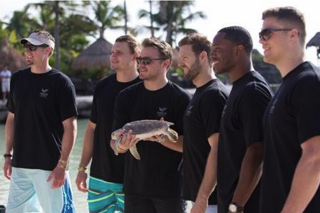 Como parte del acuerdo entre Experiencias Xcaret y Ultimate Fan Vacations, un grupo de jugadores de la National Football League (NFL) participaron en el Programa de Liberación de Tortugas Marinas en la caleta del ecoparque de Xcaret.