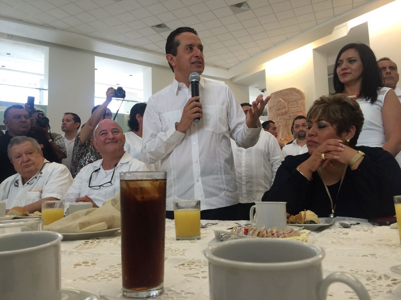 En su mensaje en la máxima tribuna de la entidad, acompañado por el Secretario de Turismo, Enrique de la Madrid Cordero, quien acudió con la representación presidencial, sostuvo que “es hora de recobrar la confianza en el gobierno”, y nuevamente hizo un llamado a los ciudadanos para trabajar en conjunto: “Tenemos que practicar un gobierno confiable y honesto que combata las prácticas corruptas del pasado” (en alusión a su antecesor Roberto Borge Angulo), señaló ante los dirigentes nacionales del PAN (Ricardo Anaya Cortés), PRD (María Alejandra Barrales Magdaleno), y agregó que “es inaplazable restablecer el poder al servicio del pueblo”.