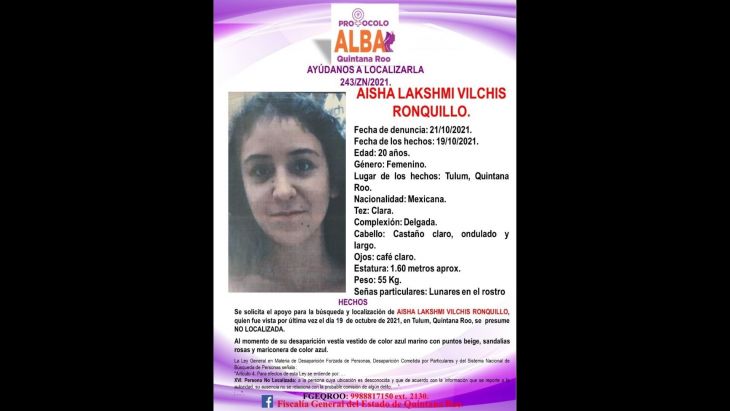 “Solicitamos su colaboración para localizar a Aisha Lakshmi Vilchis Ronquillo, vista por última vez el 19 de octubre de 2021 en el municipio de Tulum, Quintana Roo. Si tiene información acerca de su paradero, favor de comunicarse al 998 8817150 ext. 2130”, publicó la Fiscalía estatal en sus redes sociales.