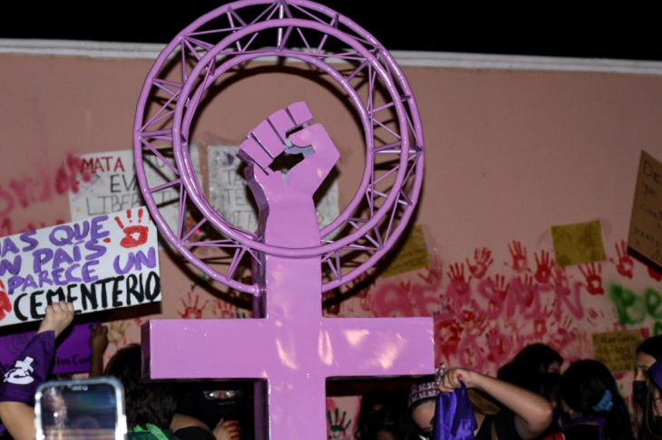 Alrededor de las 19 horas realizaron la develación de la estructura que mide casi dos metros y muestra el símbolo de la mujer con un puño al frente para visibilizar la lucha de las mujeres contra la violencia de género.
