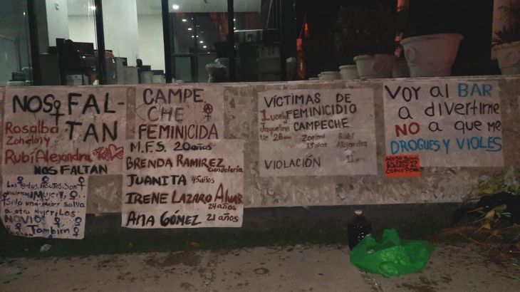 En las pintas y cartulinas, podían leerse nombres de las recientes víctimas de feminicidio en el estado y donde hubo detenidos y sentencia condenatoria de cadenas perpetuas; además lemas conocidos como “Nos faltan…” y nombres de víctimas, entre otras.