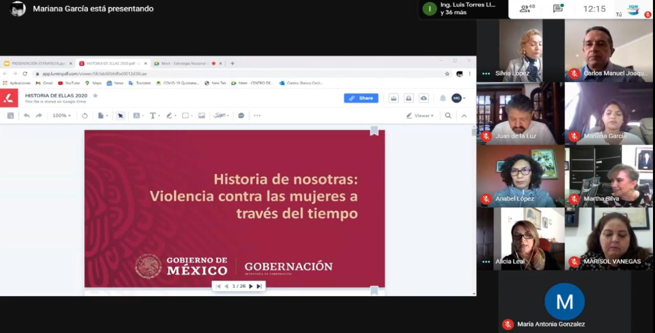 En la reunión estuvieron presentes Anabel López Sánchez, directora general para Una Vida Libre de Violencia y para la Igualdad Política y Social del Instituto Nacional de las Mujeres (Inmujeres); Sayda Yadira Blanco Morfín, directora de atención y seguimiento de Alerta de Violencia de Género de la Comisión Nacional para Prevenir y Erradicar la Violencia Contra las Mujeres (Conavim) y María Antonia González del Castillo, directora general adjunta de igualdad de género del Instituto Nacional de Desarrollo Social (Indesol).
