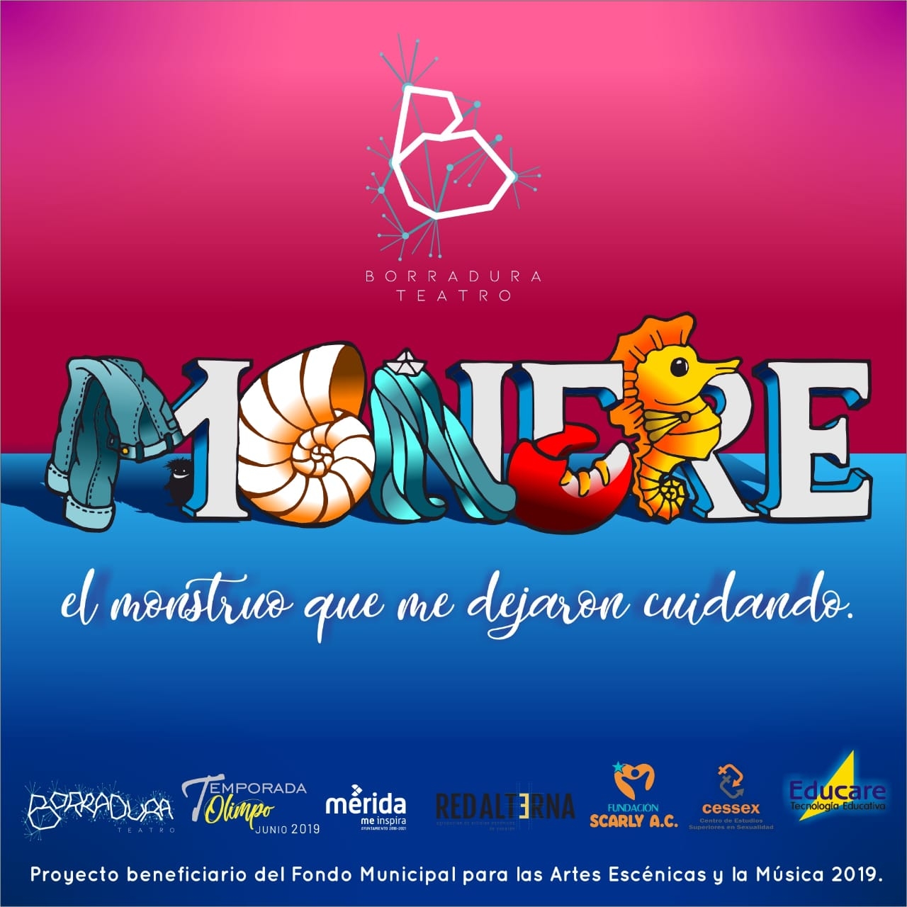[i]Monere, el monstruo que me dejaron cuidando[/i] es una puesta en escena que explora el proceso de recuperación de las personas que han sufrido abuso sexual en la infancia. Esta obra original de Borradura Teatro y apoyada por el Fondo Municipal para las Artes Escénicas y la Música 2019 se estrenará este 13 de junio en el Centro Cultural Olimpo y tendrá funciones los días 14 y 15, 21, 28 y 29 del mismo mes.