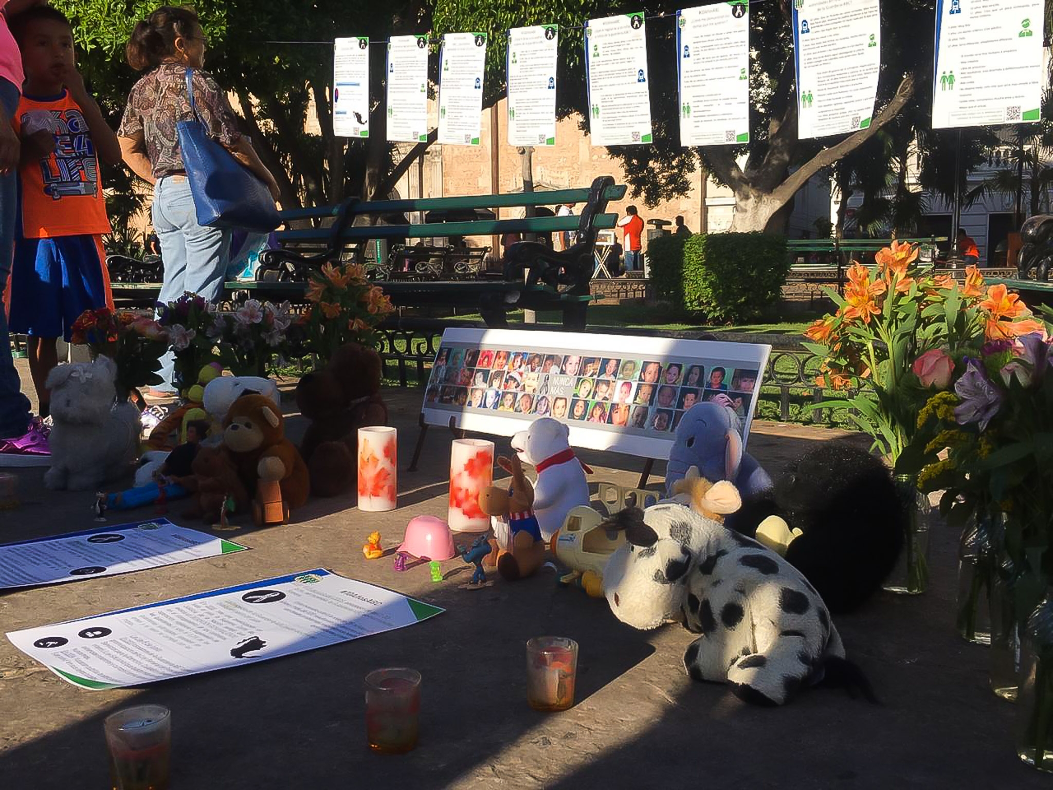 Los afiches fueron expuestos durante una manifestación realizada en el primer cuadro de la ciudad para exigir justicia en el caso de la guardería ABC, localizada en Hermosillo, Sonora, donde en el 2009 un incendio ocasionó la muerte de 25 niñas y 24 niños, así como heridas de distinta magnitud en otros 106 menores.