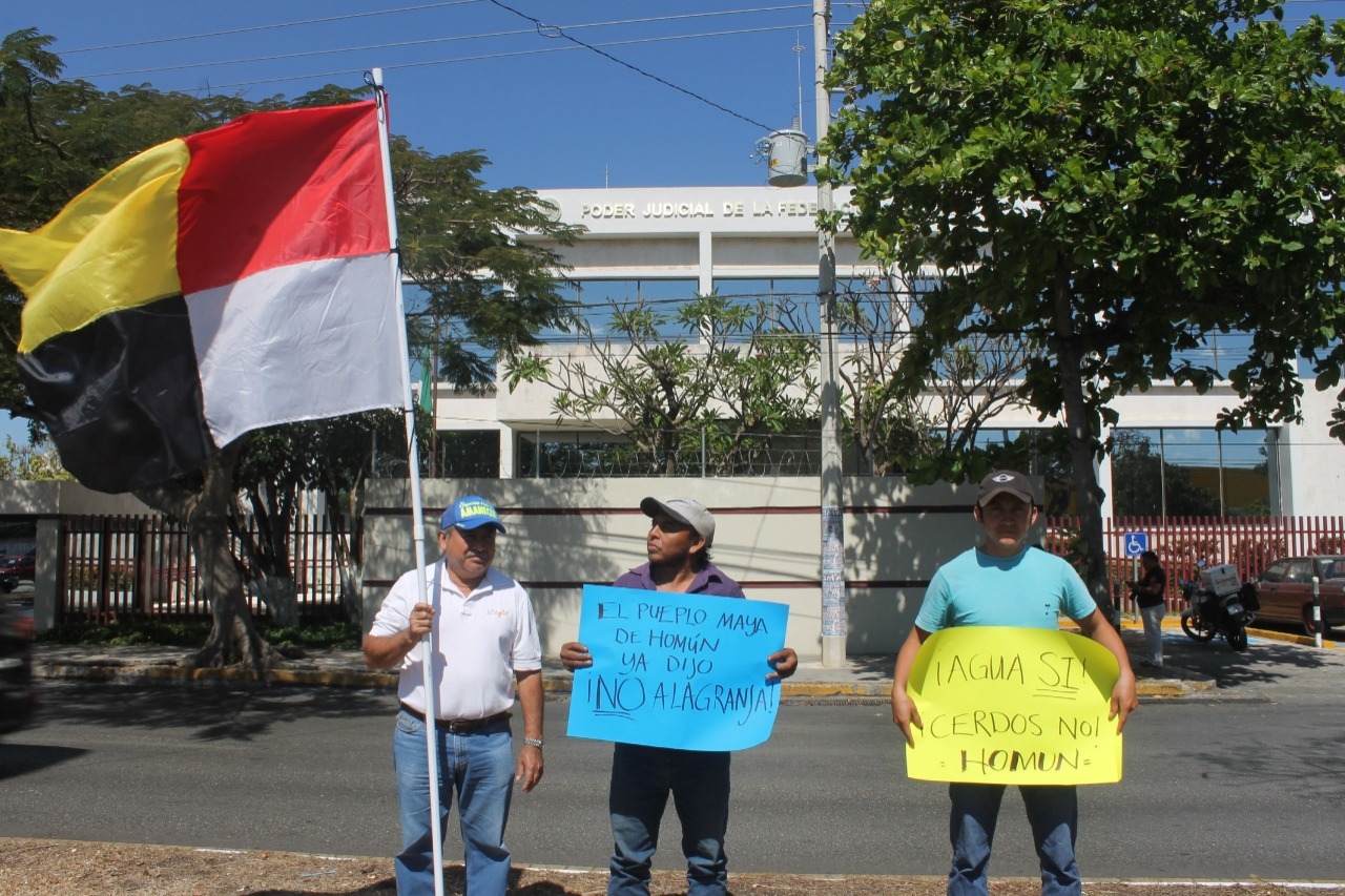 Afuera del tribunal personas de Homún se manifestaron con tambores, con la bandera maya y con pancartas de rechazo a la granja y reivindicando el derecho del pueblo a decidir. Cabe señalar que mientras esto sucedía, un fuerte despliegue policíaco se observó por la la avenida. Más de cinco camionetas con antimotines pasaron frente al tribunal y se estacionaron cerca del Tribunal por un lapso de media hora.