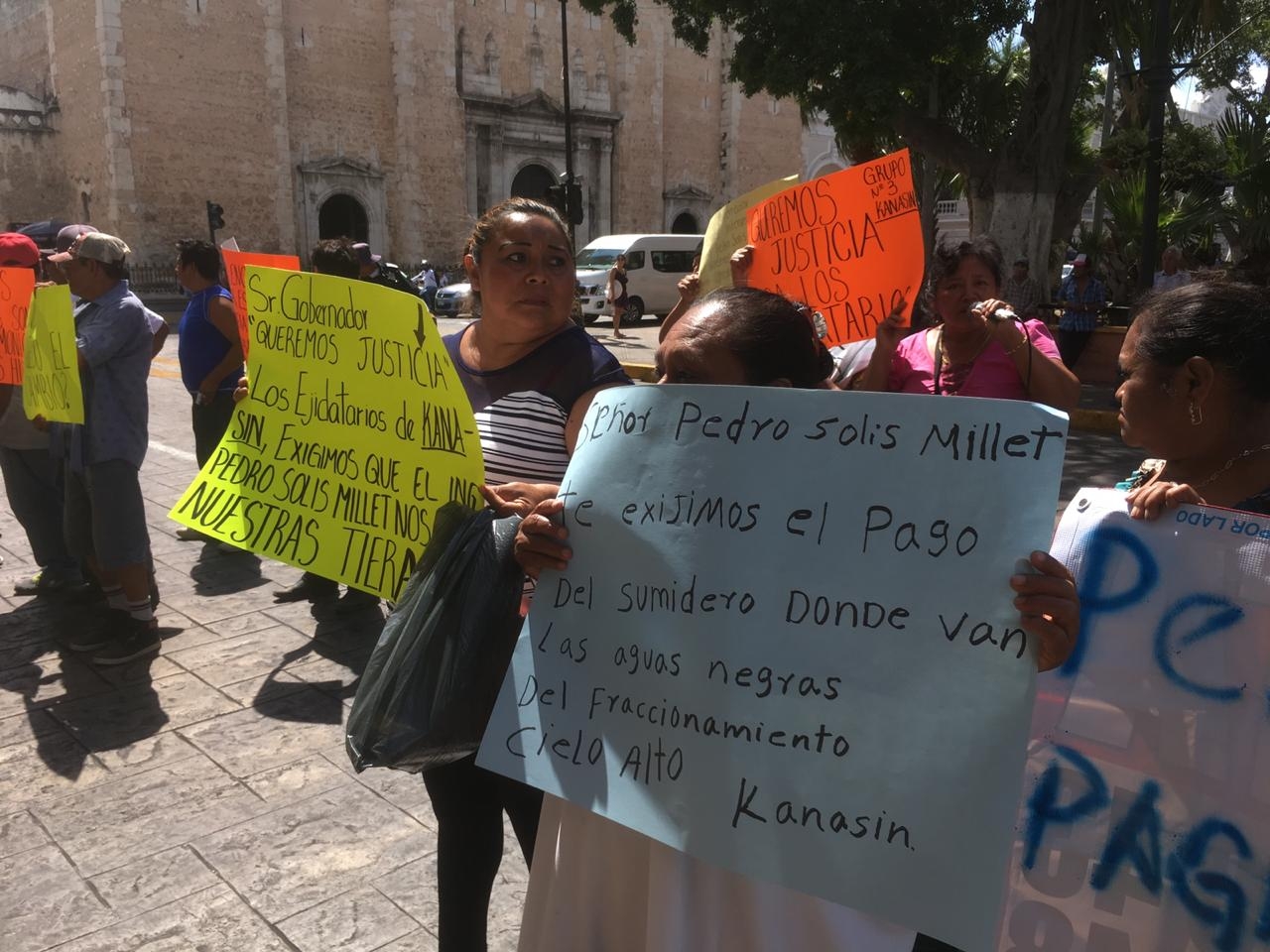 Ejidatarios del municipio de Kanasín protestaron en el Centro Histórico de Mérida solicitando la intervención del gobierno estatal para que les sean pagadas varias tierras que fueron utilizadas por el empresario Pedro Solís Millet, como un sumidero de aguas negras del fraccionamiento Cielo Alto, por un monto superior de 6 millones de pesos.