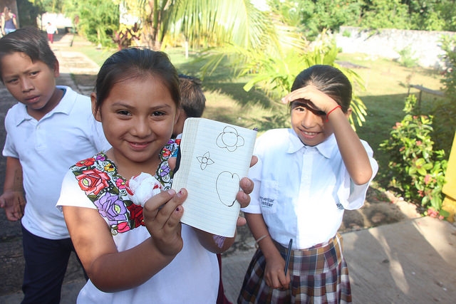 “Aquí traté de construir. Mis maestros y yo no somos mayahablantes, la mayoría de los niños, si no es que todos, sí lo son y tratamos de compensar eso invitando a personas como Patricia Martínez Huchim para venga a leerles en maya, a abuelos de la comunidad que vienen a contar historias o personas que les hablan de cosas como la milpa y las abejas. Los niños les dicen a sus papás ‘Me tienes que enseñar maya’”, afirma.