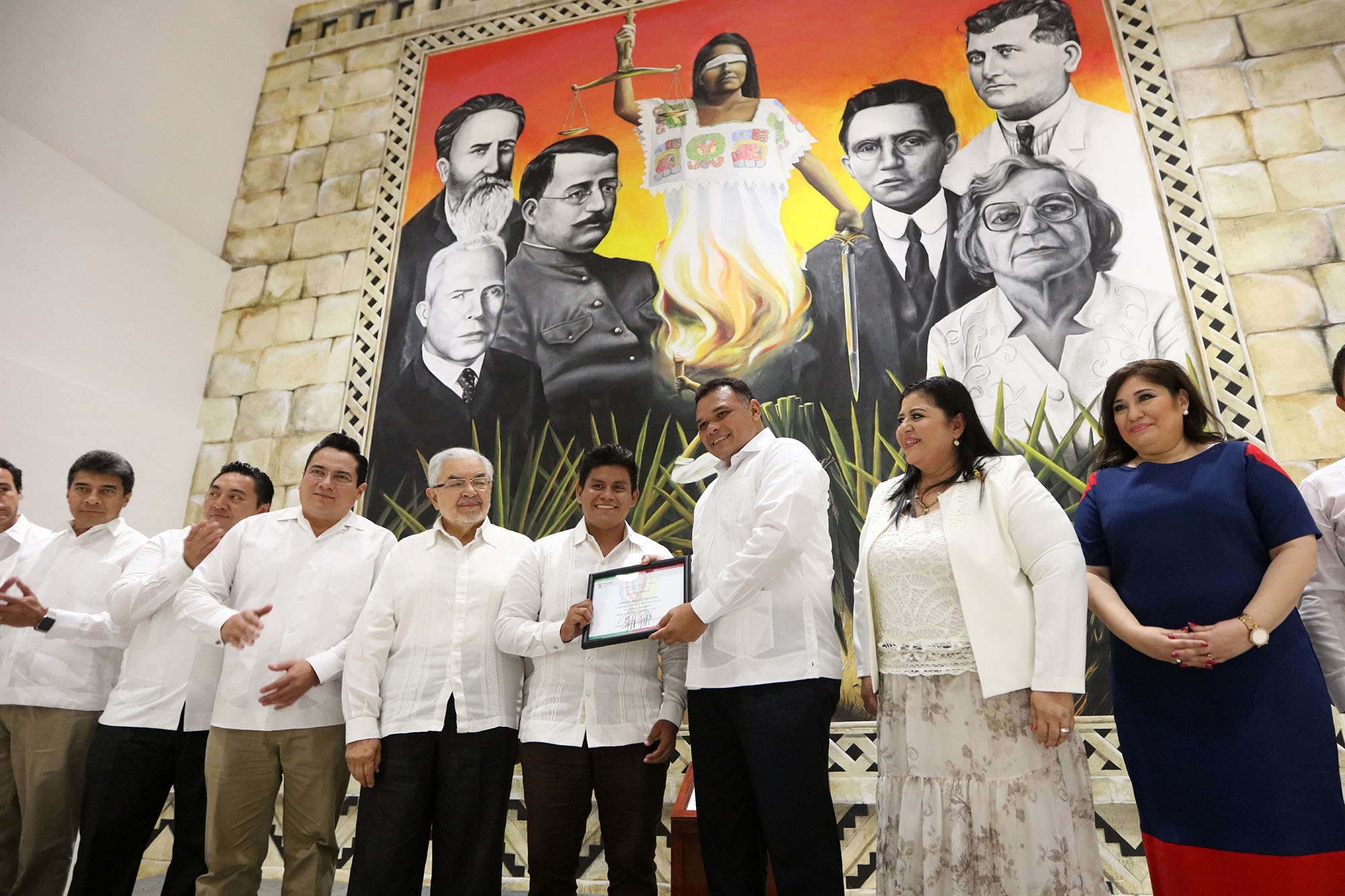El artista, originario de Umán y estudiante de la Universidad Tecnológica Metropolitana (UTM), recibió de manos de Zapata Bello un reconocimiento a su creatividad y capacidad para transmitir emociones a través de la imagen, rasgos que demostró durante las siete semanas de realización del mural, en el que plasmó la grandeza del pueblo yucateco.