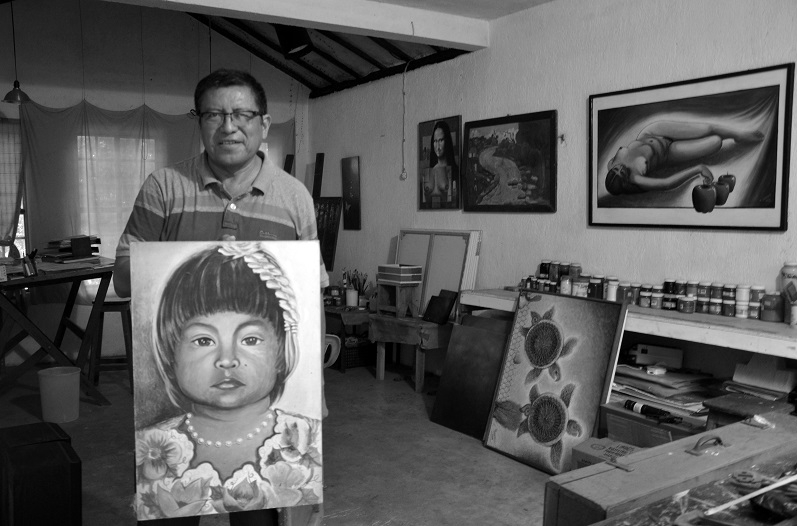 Caminamos a través del salón en medio de los bastidores llenos y vacíos de pintura, recordó uno de sus cuadros de pintura favorito antes de salir, así que regresó sobre sus escasos tres pasos para sacarlo: “esta es Deira cuando era niña”, dice orgulloso mientras platicamos de la niña que ahora se va a Brasil a estudiar su doctorado. En ese momento resultó imposible detener el impulso de obturar mi cámara y registrar la escena, única para un artista que sigue aprendiendo con cada impulso de su creatividad.