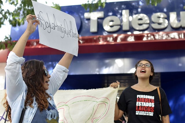 “Personas libres, estados laicos. Ni del estado ni de la iglesia, mi cuerpo es mío”, reza una de las pancartas que porta una activista por los derechos de las mujeres a las puertas del canal de televisión Telesur, durante la manifestación llevada a cabo la tarde de este jueves con motivo de un video difundido por dicho medio, en el cual se compara la interrupción del nacimiento de una tortuga marina con la de un ser humano y se exhorta a los internautas a “etiquetar a tu amiga que quiere abortar”.