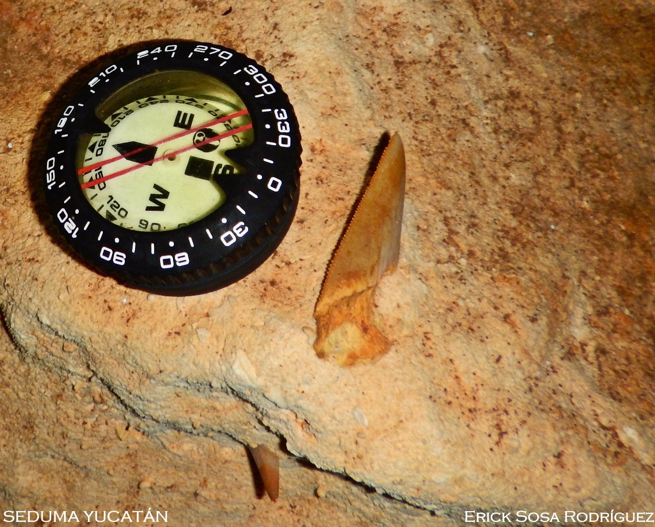 Durante los trabajos del Conteo Estatal de Cenotes y Grutas, se hallaron fósiles sumergidos a 25 metros de profundidad y a 100 metros de penetración aproximadamente, y entre los que se encontraban dos dientes de un tiburón prehistórico.