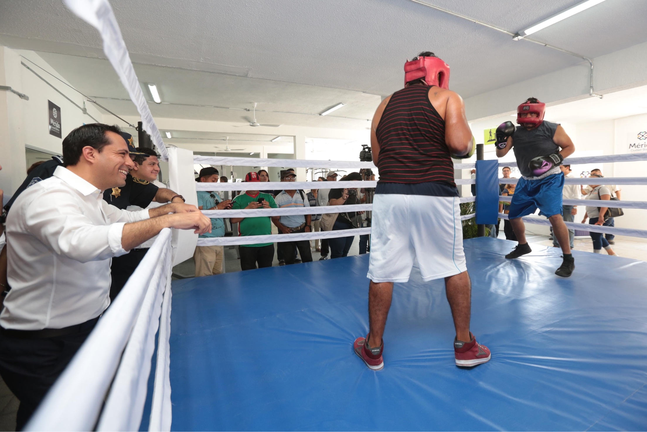 Luego del acto protocolario y el corte de listón inaugural, Vila Dosal acompañado del director de la Policía Municipal, Mario Arturo Romero Escalante, recorrió las instalaciones del gimnasio y presenció clases muestra de box y aikido.